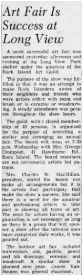 Rock Island Art Guild’s main force was Sally MacMillan, who moved to Rock Island from Florida in the early 1950’s. She had experienced outdoor art shows in Florida, and felt that was just what Rock Island needed. Sally discussed the idea with two friends, Mrs. George McDonald and Mrs. C.E. Laughlin. A few phone calls and conversations later, a meeting was set up on September 7, 1955 at the home of Mr. and Mrs. Frederick White, and the Rock Island Art Guild was formed. There were 40 people in attendance who created a statement of purpose and made a meeting schedule for the year. An annual membership fee was established, which would cover modest expenses for the first Rock Island Art Guild Outdoor Show scheduled for October 8, 1955 in Long View Park, Rock Island.